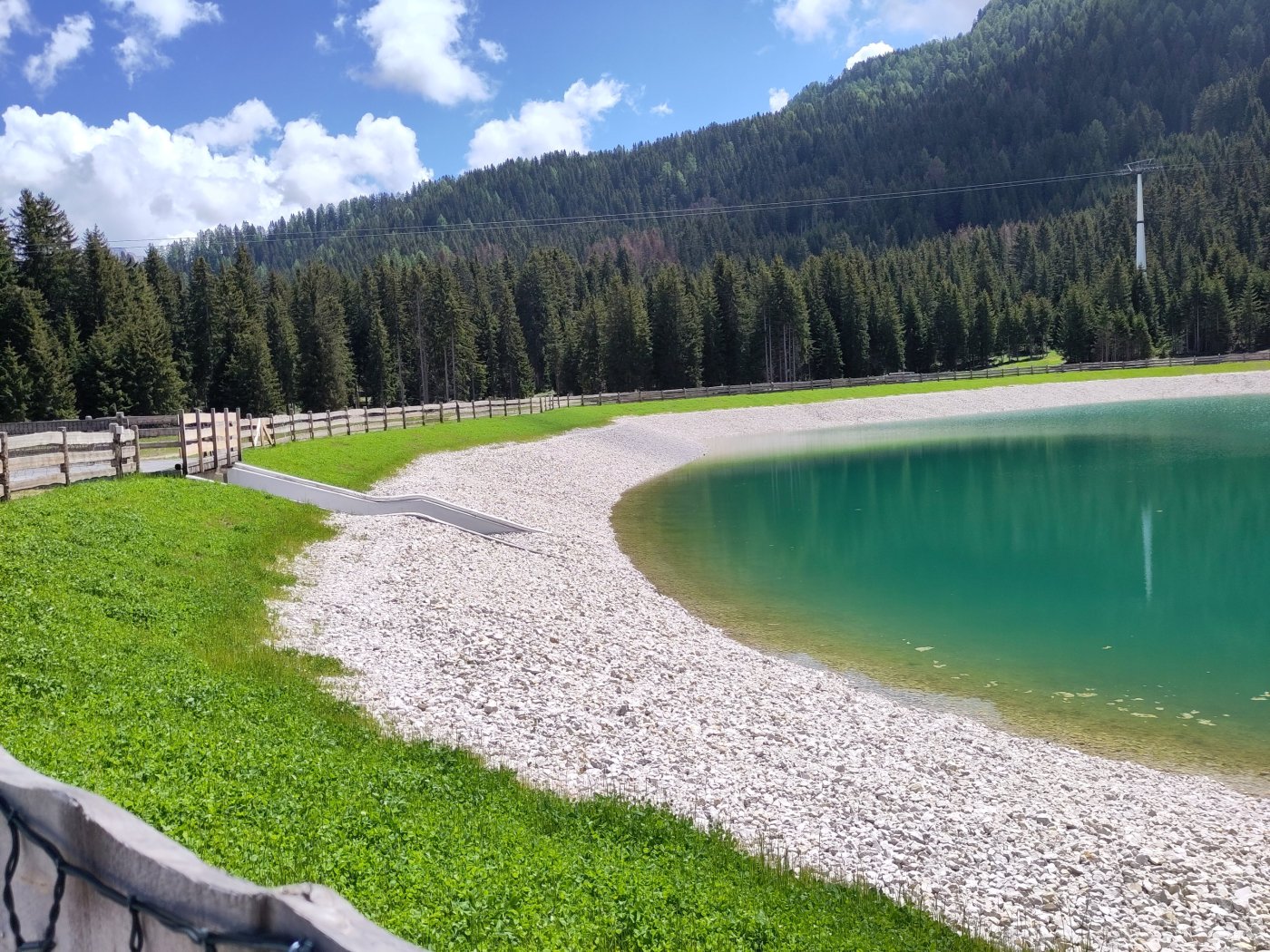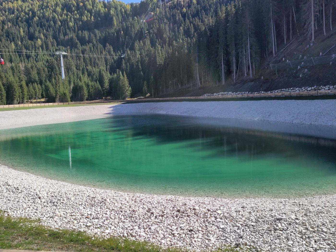 Die Beschneiungsanlage des Skigebietes Saslong, auf dessen Talabfahrt alljährlich das traditionelle Weltcuprennen stattfindet, entsprach nicht mehr den Anforderungen. Aus diesem Grund wurde ein Potenzierungsprojekt ausgearbeitet und umgesetzt. Dieses betraf die Errichtung einer Pumpstation, um das vom Alperiakraftwerk abgearbeitete Triebwasser über eine neue Transportleitung in das Skigebiet zu fördern sowie die Verlegung einer umfangreichen Anzahl neuer Beschneiungsleitungen. Als Kernstück des Potenzierungsprojektes wurde in der Nähe der berühmt-berüchtigten Kamelbuckel ein neues Speicherbecken realisiert. Das Becken weist ein nutzbares Speichervolumen von 80.000 m³ (derzeit dürfen nur 50.000 m³ genutzt werden). Durch die Befüllung des Beckens in den Monaten der Schneeschmelze mit Wasser aus dem in der Nähe vorbeifließenden Ampezzanbach kann in Zukunft großteils auf mit Pumpstrom aus dem Tal befördertes Wasser verzichtet werden.