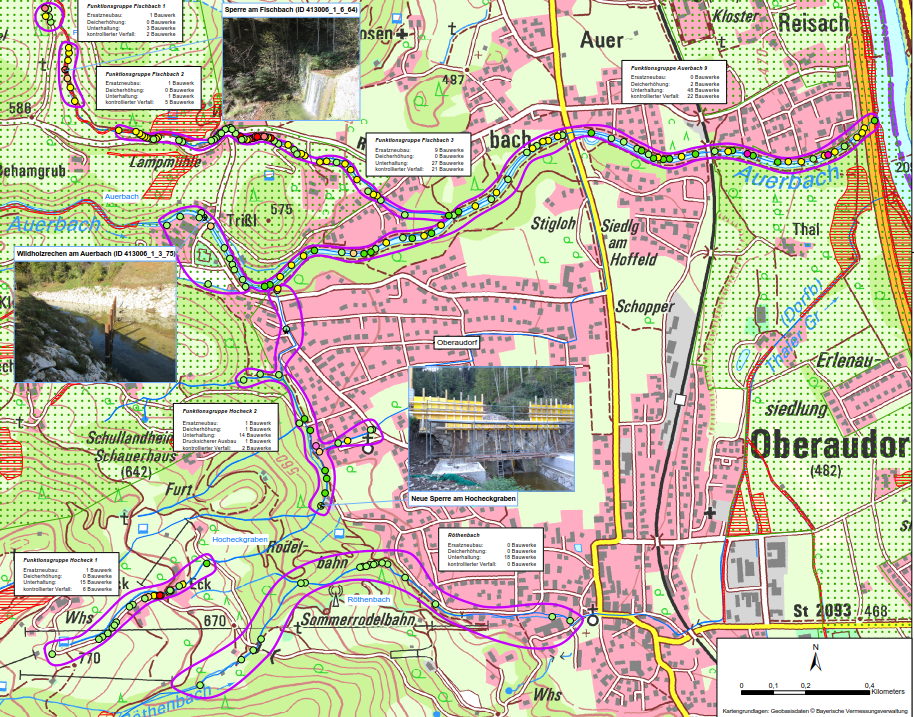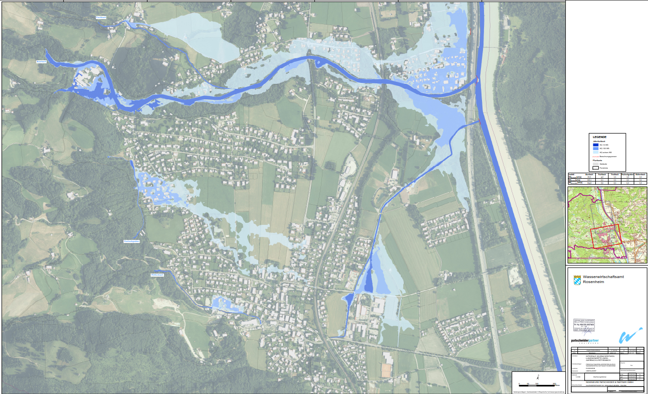 Die Ingenieure Patscheider & Partner GmbH wurde mit der Erarbeitung der integralen Wildbachentwicklungskonzepte für den Auerbach und den Röthenbach in der Gemeinde Oberaudorf beauftragt. Im Rahmen der Gefahrenanalyse wurden sämtliche vorhandenen Schutzbauten mittels Ortsbegehungen auf ihren Zustand und ihre Funktionalität bewertet, vergangene Ereignisse betrachtet und darauf aufbauend mittels hydrodynamischer Modellierung die Überschwemmungsflächen des Auerbaches, des Fischbaches, des Hocheckgrabens, des Trisslbaches und des Röthenbaches innerhalb der Ortslage von Oberaudorf ermittelt. In einer zweiten Projektphase wurden im Zuge des Variantenstudiums Varianten erarbeitet, um die Schutzziele zu erreichen. Für die Optimalvariante wurde gemäß den Vorgaben des LfU eine Kostenschätzung (inklusive Unterhaltungsmaßnahmen für einen Zeitraum von 100 Jahren) ausgearbeitet. Schließlich wurde ein Kommunikationskonzept erstellt.