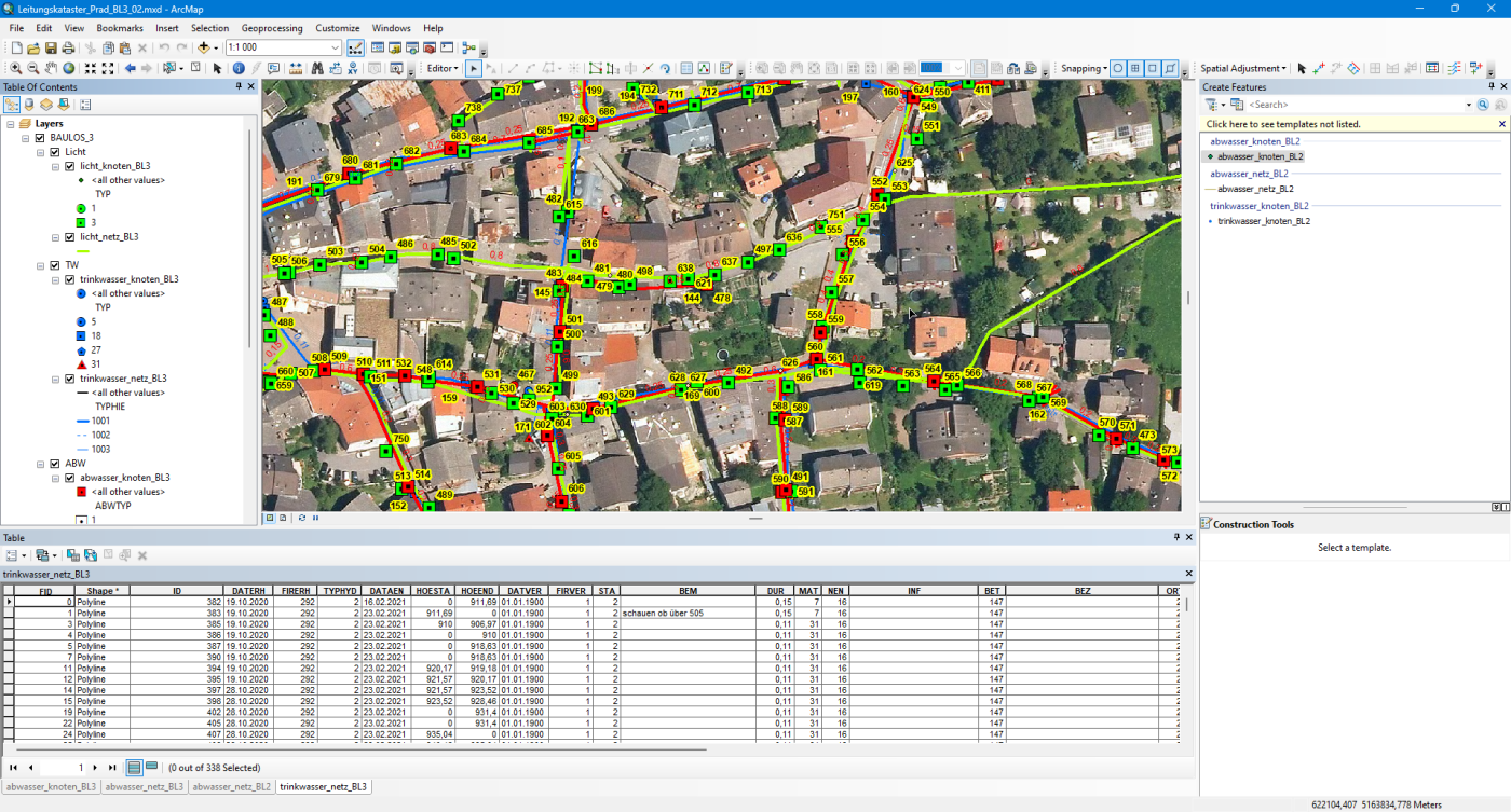 Die Aufnahme des Bestandes erfolgte in 2 Schritten. Der 1. Schritt betraf die digitale Vermessung der bestehenden Schächte, Hydranten usw. Im 2. Schritt wurden alle vermessenen Punkte einzeln aufgenommen. Dabei wurden verschiedene Attribute erhoben. Diese betrafen die Beschaffenheit der Armaturen, Rohrleitungen und Schächte, die Materialien und die Durchmesser der einzelnen Komponenten.