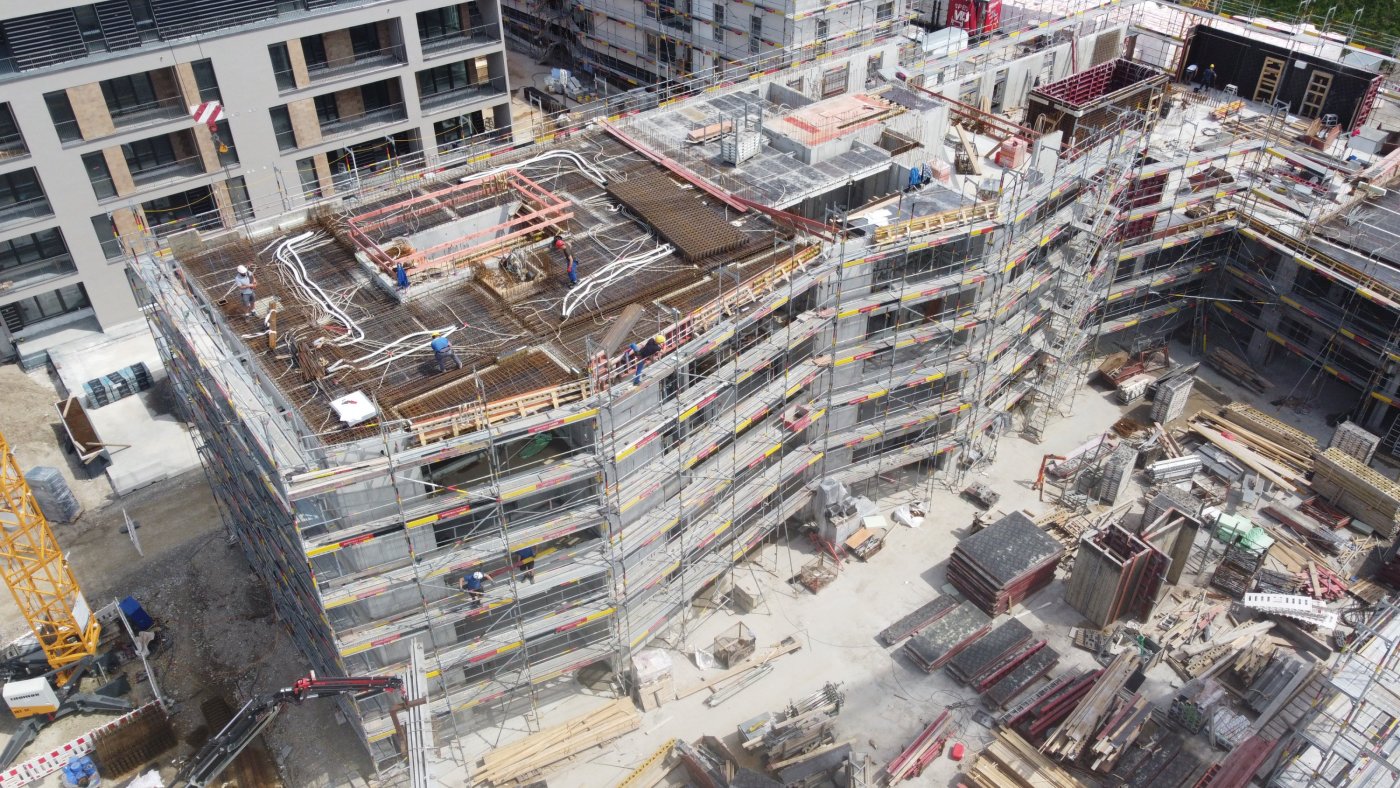 Die Tragstruktur der gesamten Wohnanlage wird in klassischer Stahlbetonbauweise mit Flachdecken, Unterzügen, wandartigen Trägern, Wänden und Stützen umgesetzt. Da die tragenden Wände und Stützen teilweise nicht bis zu den Fundamenten durchgehen, werden die Lasten hier über die Flachdecken an die Tiefgaragenstützen abgeleitet. Die Aussteifung erfolgt über betonierte Wand- bzw. Deckenscheiben, die Gründung über eine Flachgründung über Einzel- und Streifenfundamente in den anstehenden Quartärkiesen.